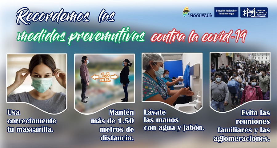 El Hospital Regional de Moquegua te recuerda que la pandemia aún no ha terminado, debes respetar las medidas preventivas contra la covid-19 que el uso correcto de la mascarilla, el permanente lavado de manos con agua y jabón , el distanciamiento social (mínimo 1.50 metros) y evita los lugares con aglomeraciones.