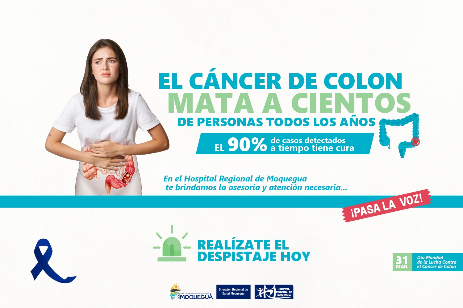 El Hospital Regional de Moquegua invita a la población a participar de la ruta de la prevención del cáncer de colon, que se realizará este jueves 31 de marzo, desde las 10:30 a.m., dentro del hospital. Especialistas en oncología, nutrición, psicología, enfermería y gastroenterología enseñarán cómo prevenir y tratar esta enfermedad. La actividad culminará con actividad física.