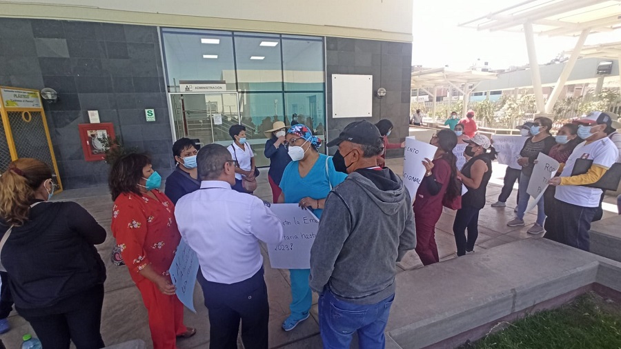 El director ejecutivo del Hospital Regional de Moquegua, Méd. José Luis Horna Donoso, dialogo con un grupo de trabajadores del Sindicato Unificado de Trabajadores de Salud (SUTSA), que realizaron un plantón.