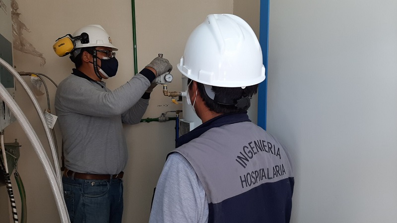 Personal de la Unidad de Servicios Generales y Mantenimiento del Hospital Regional de Moquegua brinda su apoyo en la instalación de la planta de oxígeno ubicada en el Centro de Salud de Chen Chen.