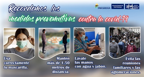 El Hospital Regional de Moquegua te recuerda que la pandemia aún no ha terminado, debes respetar las medidas preventivas contra la covid-19 que el uso correcto de la mascarilla, el permanente lavado de manos con agua y jabón , el distanciamiento social (mínimo 1.50 metros) y evita los lugares con aglomeraciones.